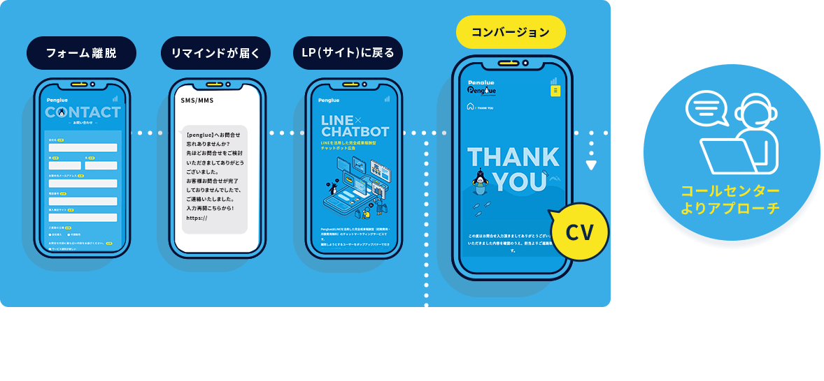 PenglueはサイトやLP、申込フォームからの離脱ユーザーに対してLINEやメール・SMSを活用してコンバージョンに導きます。